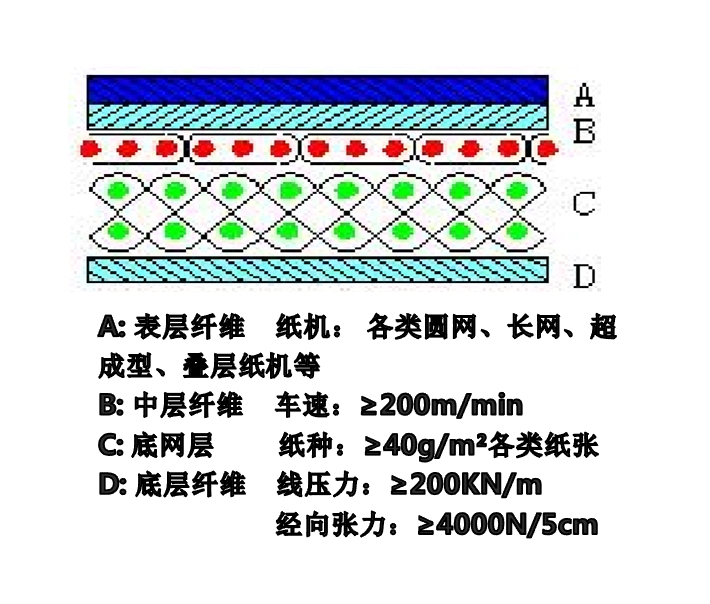 疊層 BOM 包括 1+1、1+2、1+1+1 等組織結(jié)構(gòu)的底網(wǎng)造紙毛毯,具有耐高線壓、彈性好、濾水性好、容水空間大、尺寸穩(wěn)定、能消除各類毯痕、使用壽命長等特點(diǎn)。適用于具有復(fù)合壓榨、大輥徑壓榨、靴式壓榨等壓榨形式的中高速紙機(jī),生產(chǎn)高、中檔文化用紙、板紙等各類紙張。